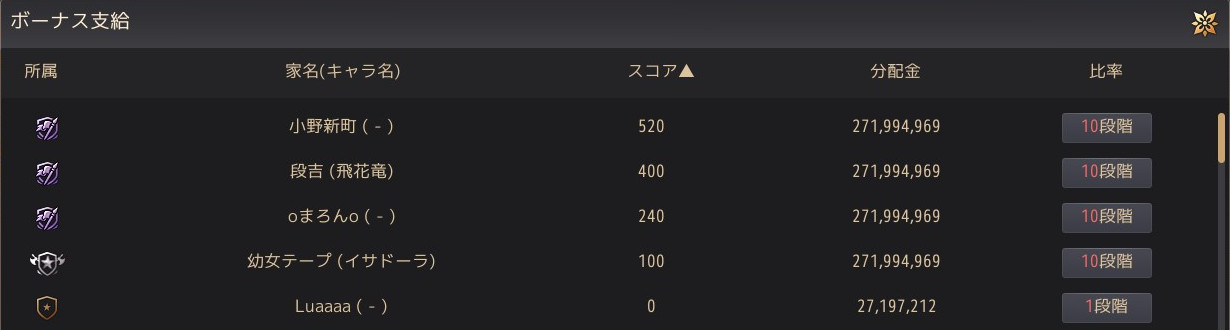 - ボーナス支給比率2段階以上のギルドメンバーが参加者となります。通常、20以上のスコアを獲得していればこれに該当しますが、通常とは異なるスコアが支給されていた場合には相応の補正が行われますのでこの限りではありません。